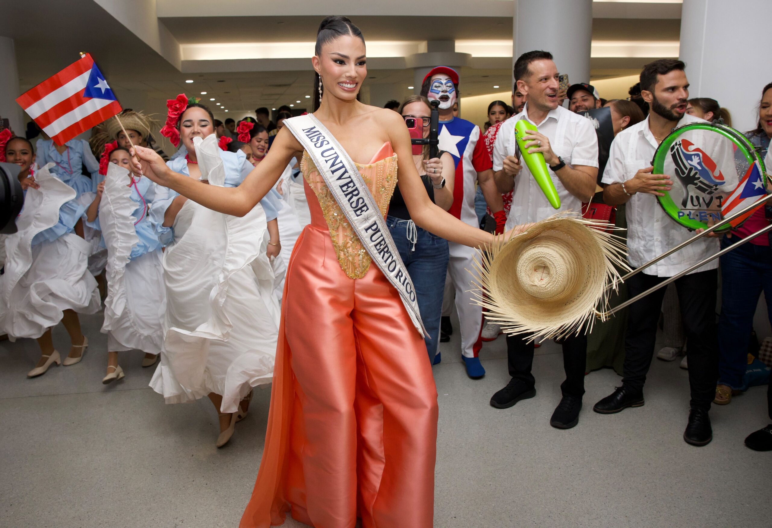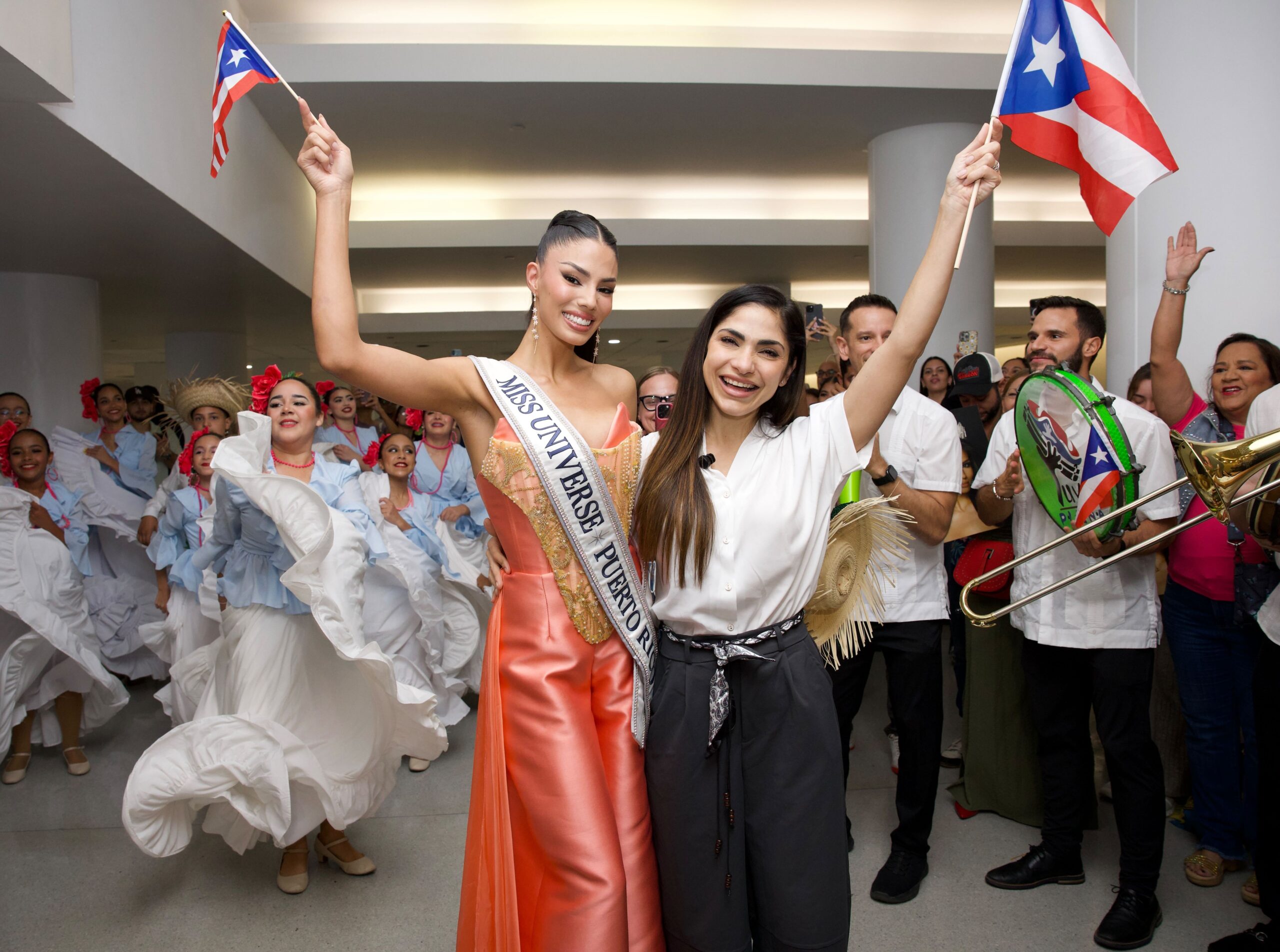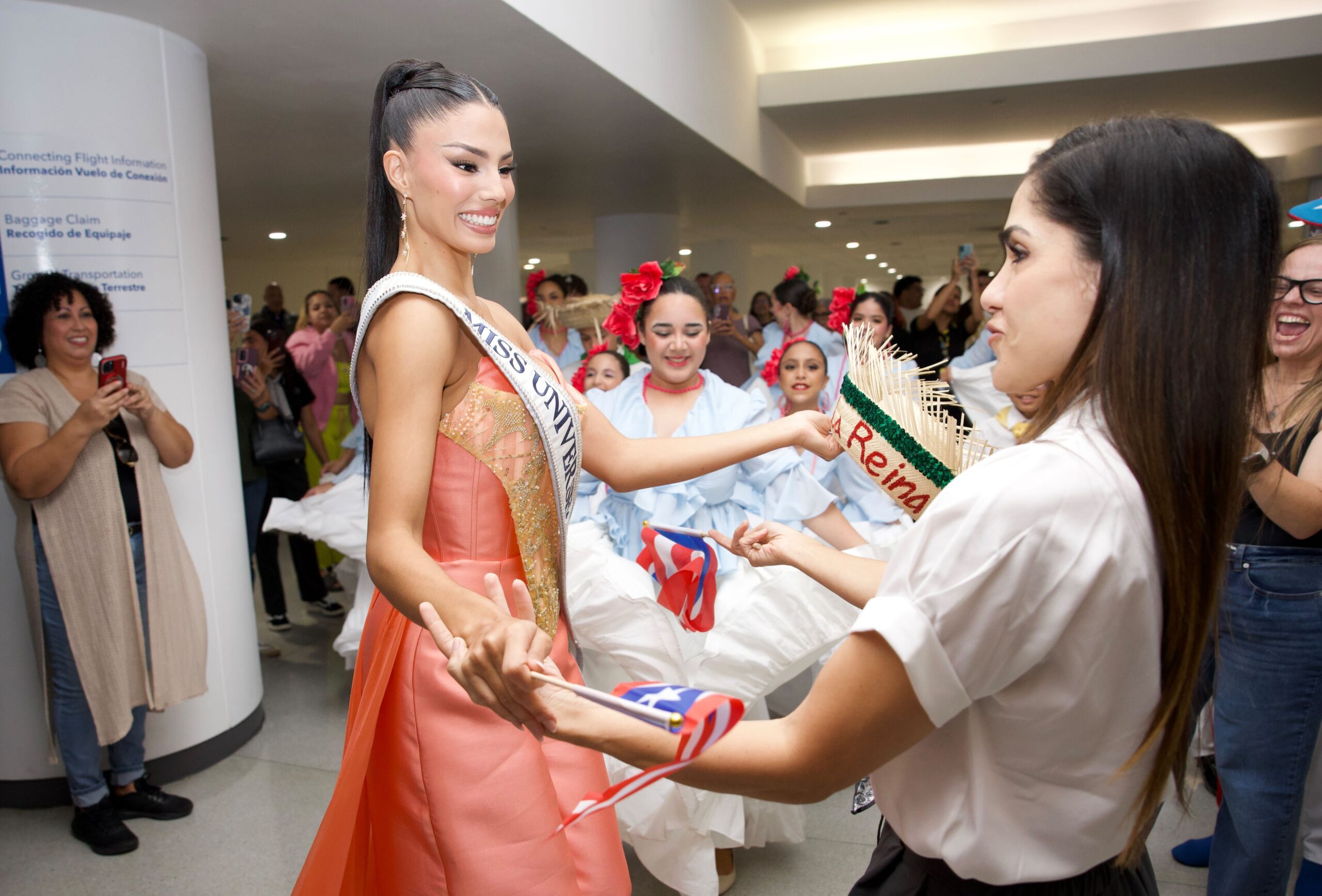 En el aeropuerto, Zashely también fue recibida con música a cargo de Yuvi Plena y la energía de los bailarines de Gíbaro de Puerto Rico, con quienes compartió con el público presente.